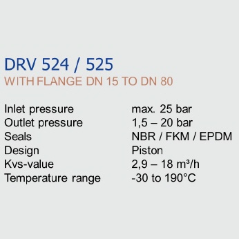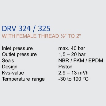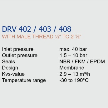 Often the temperature range of standard pressure reducers is not sufficient for your application. For such applications, various variants of the -HT series are available. This high temperature series is equipped with FKM seals (DRV 6-series EPDM). Thus, a maximum temperature resistance of 190°C (DRV 6-series 130°C) is achieved with FKM seals in combination with metallic internal parts.