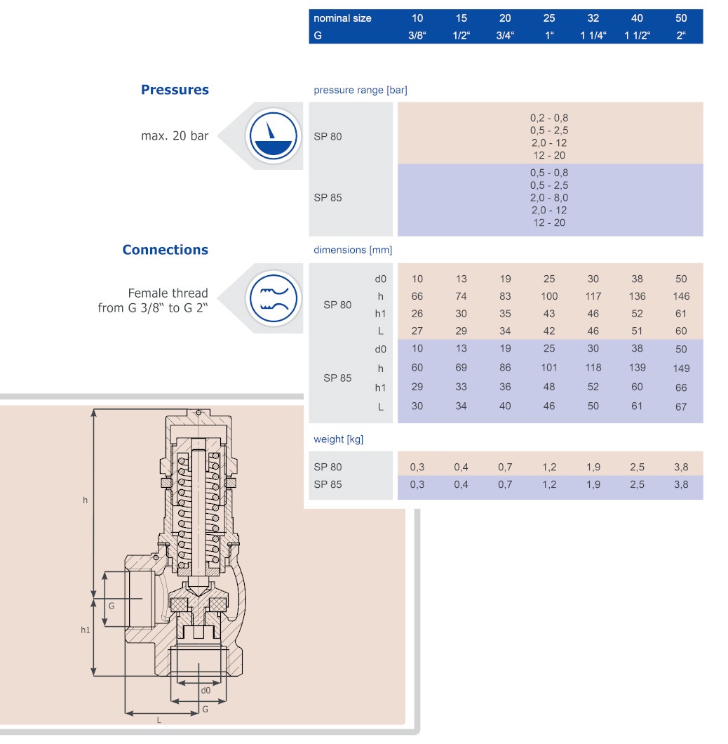 Direct-acting, spring-loaded angle overflow valve for steam and gaseous media and liquids. Resistant to oil, lead-free petrol and benzene.