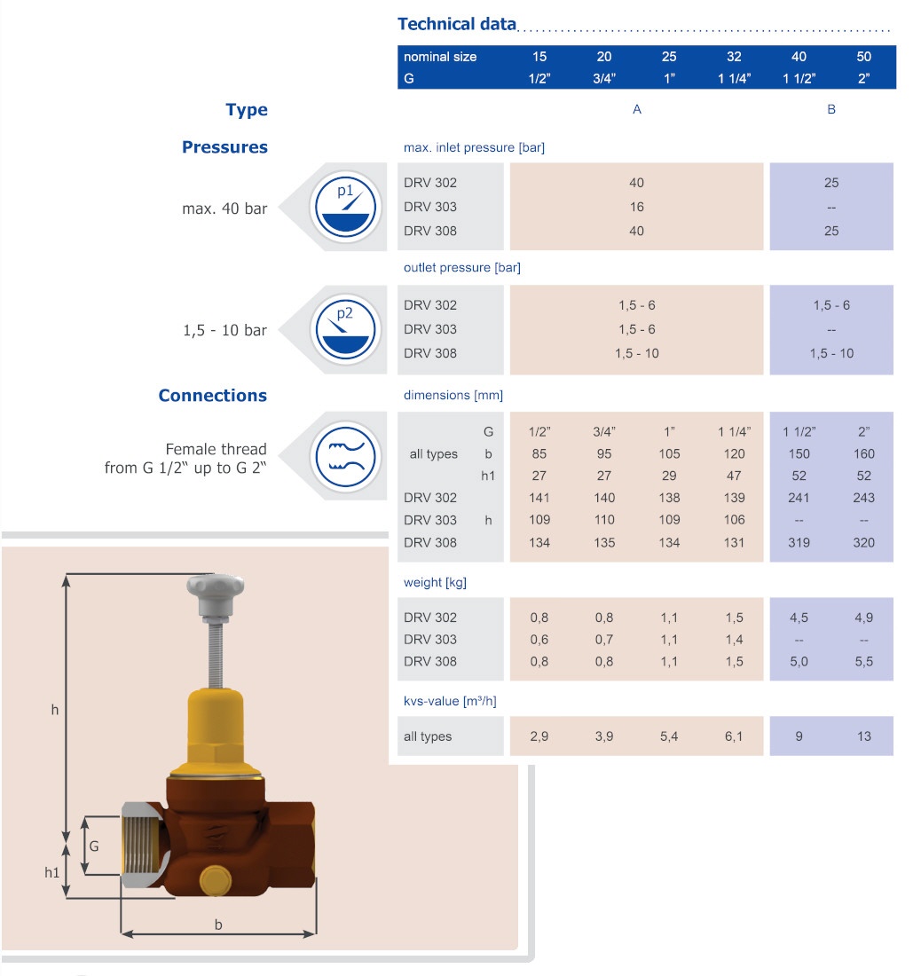 Pressure reducing valves of the series are diaphragm-controlled, spring-loaded pressure reducing valves and have inlet pressure compensation. The cartridge design allows easy replacement of the internal parts.