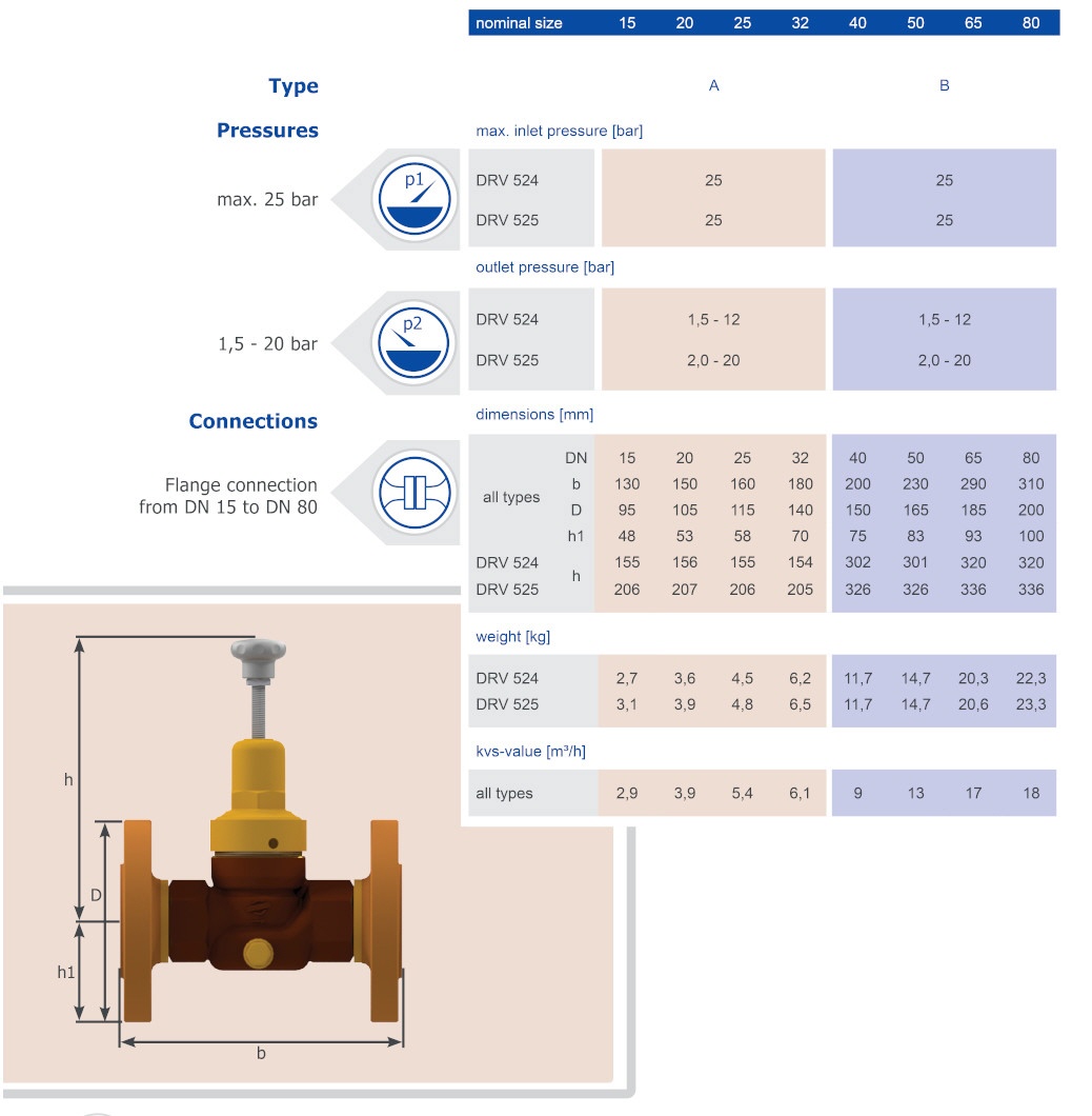 Pressure reducing valves of the series are piston-controlled, spring-loaded pressure reducing valves and have inlet pressure compensation. The cartridge design allows easy replacement of the internal parts.