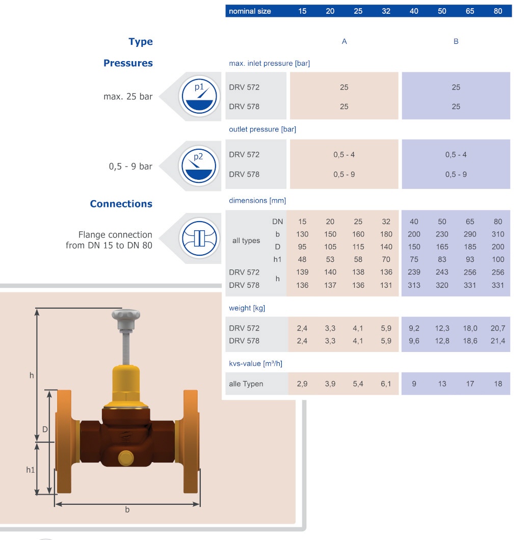 Pressure reducing valves of the series are diaphragm-controlled, spring-loaded pressure reducing valves and have inlet pressure compensation. The cartridge design allows easy replacement of the internal parts.
