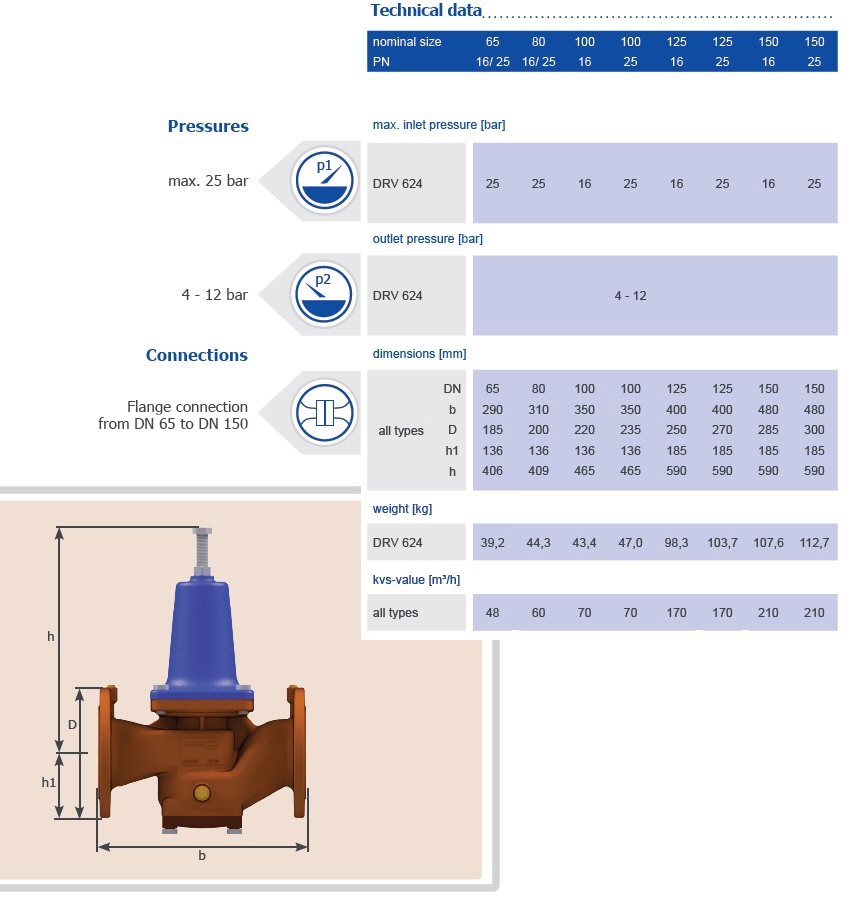 Pressure reducing valves of the series are piston-controlled, spring-loaded pressure reducing valves and have an inlet pressure compensation. All sizes are available with flanges according to DIN, ANSI or JIS.