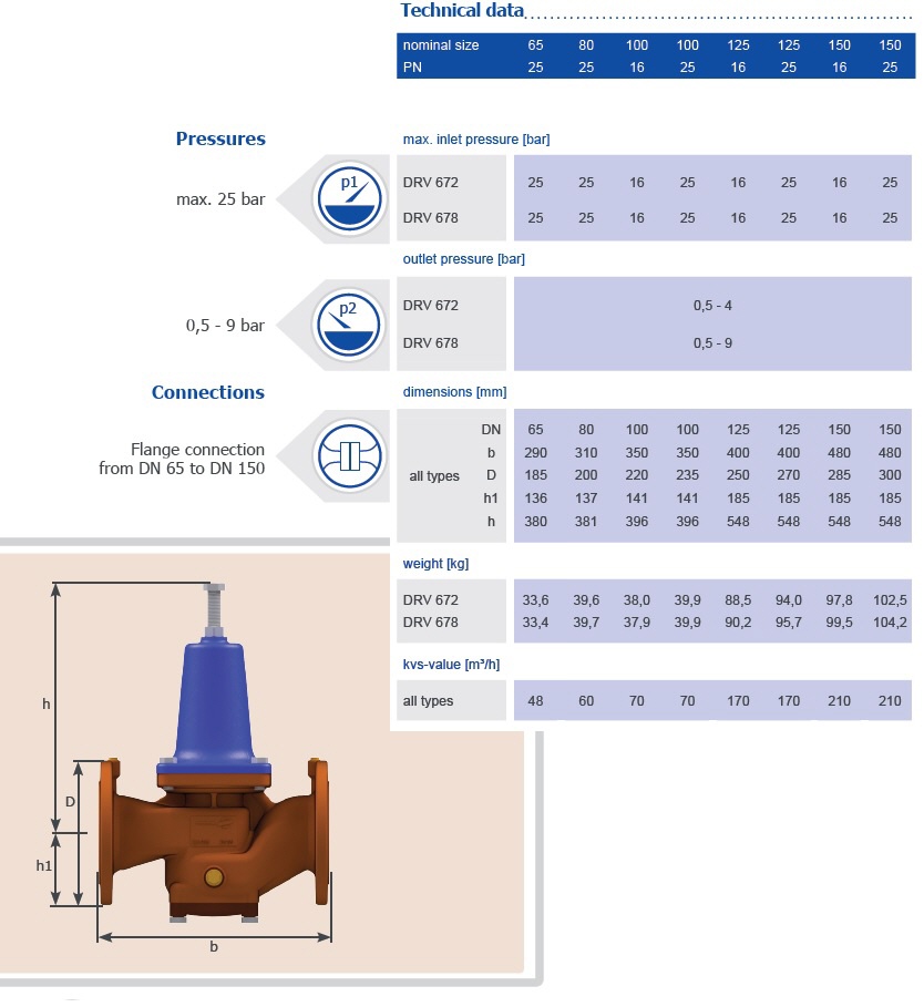 Pressure reducing valves of the series are diaphragm-controlled, spring-loaded pressure reducing valves and have inlet pressure compensation. All sizes are available with flanges according to DIN, ANSI or JIS.