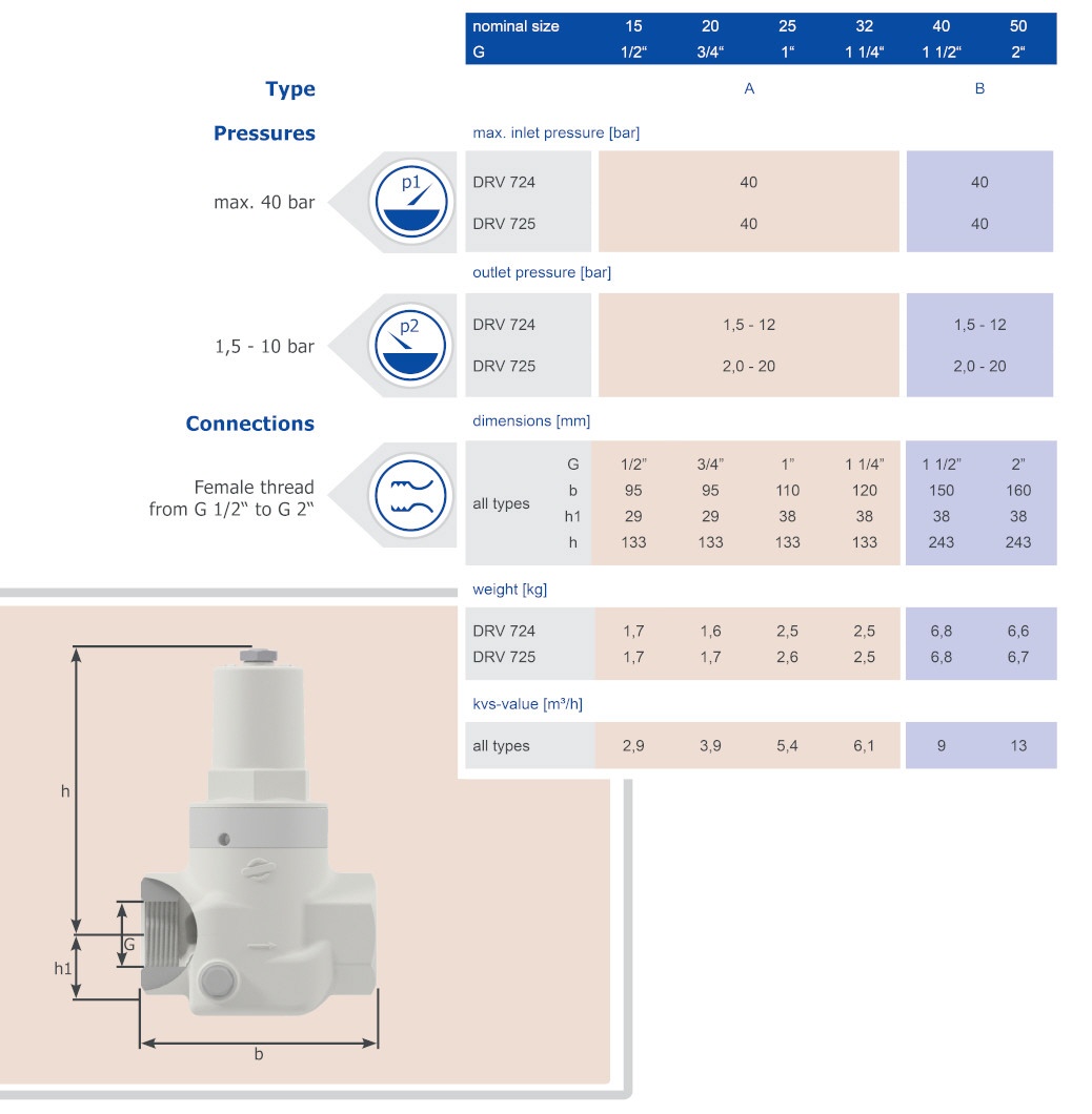 Pressure reducing valves of the series are piston-controlled, spring-loaded pressure reducing valves and have inlet pressure compensation. The cartridge design allows easy replacement of the internal parts.