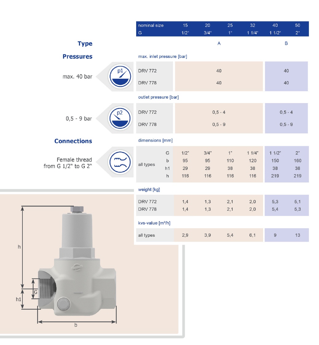 Pressure reducing valves of the series are diaphragm-controlled, spring-loaded pressure reducing valves and have inlet pressure compensation. The cartridge design allows easy replacement of the internal parts.