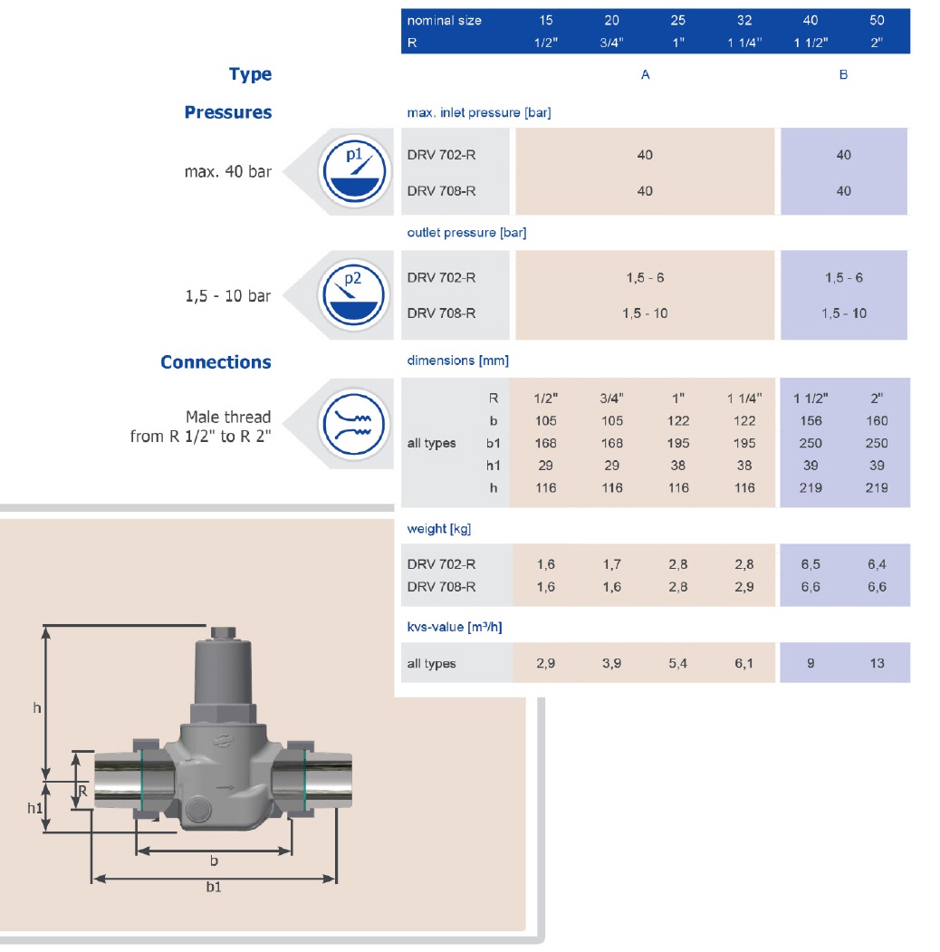 Pressure reducing valves of the series are diaphragm-controlled, spring-loaded pressure reducing valves and have inlet pressure compensation. The cartridge design allows easy replacement of the internal parts.