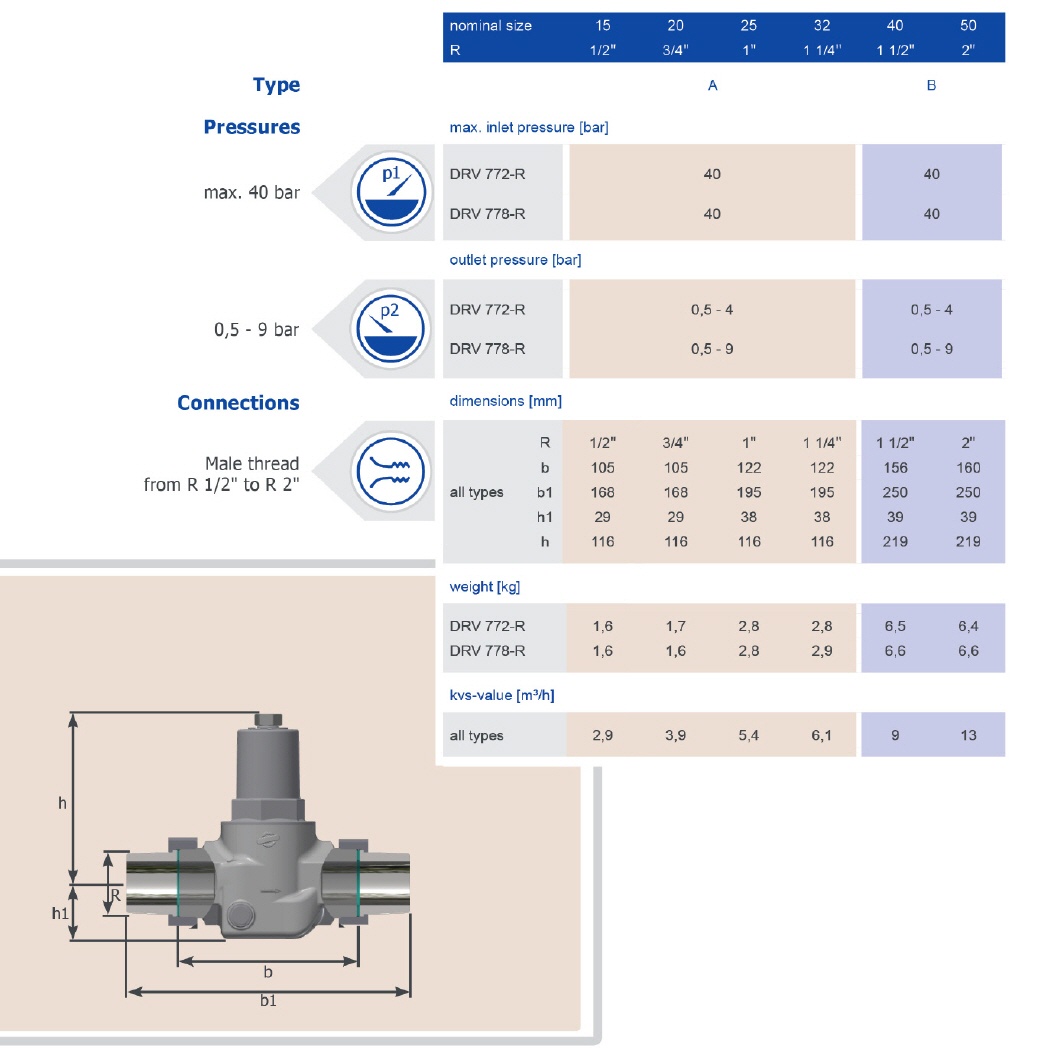 Pressure reducing valves of the series are diaphragm-controlled, spring-loaded pressure reducing valves and have inlet pressure compensation. The cartridge design allows easy replacement of the internal parts.