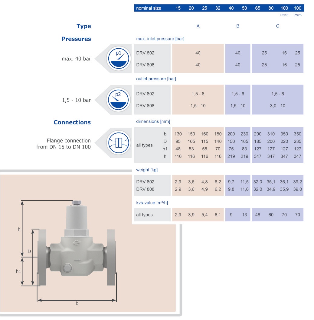 Pressure reducing valves of the series are diaphragm-controlled, spring-loaded pressure reducing valves and have inlet pressure compensation. The cartridge design allows easy replacement of the internal parts. All sizes are available with flanges according to DIN, ANSI or JIS.