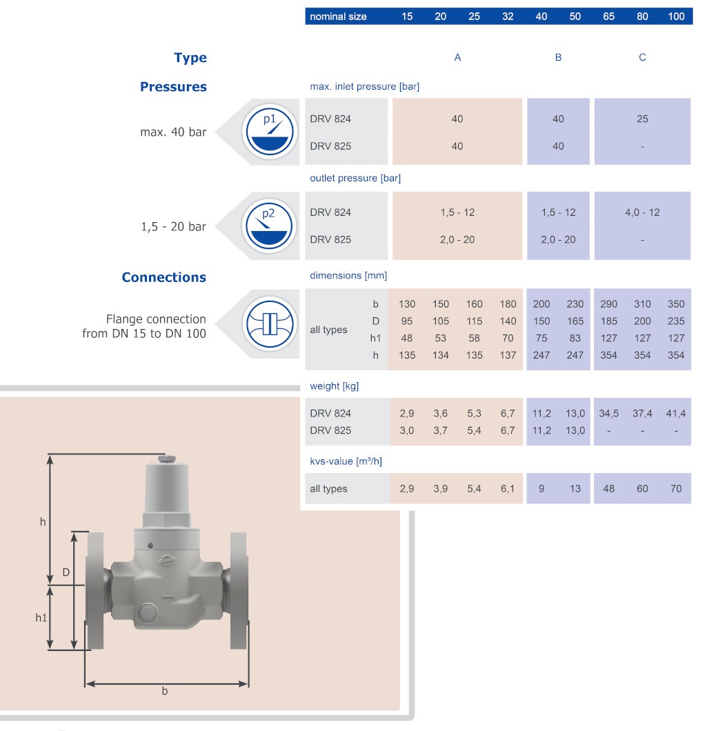 Pressure reducing valves of the series are piston-controlled, spring-loaded pressure reducing valves and have inlet pressure compensation. The cartridge design allows easy replacement of the internal parts. All sizes are available with flanges according to DIN, ANSI or JIS.