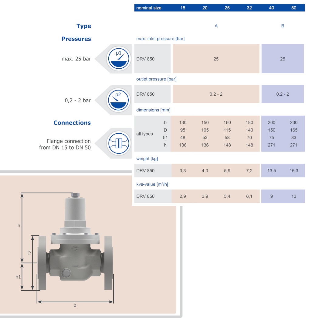 Pressure reducing valves of the series are diaphragm-controlled, spring-loaded pressure reducing valves and have inlet pressure compensation. The cartridge design allows easy replacement of the internal parts. All sizes are available with flanges according to DIN, ANSI or JIS.